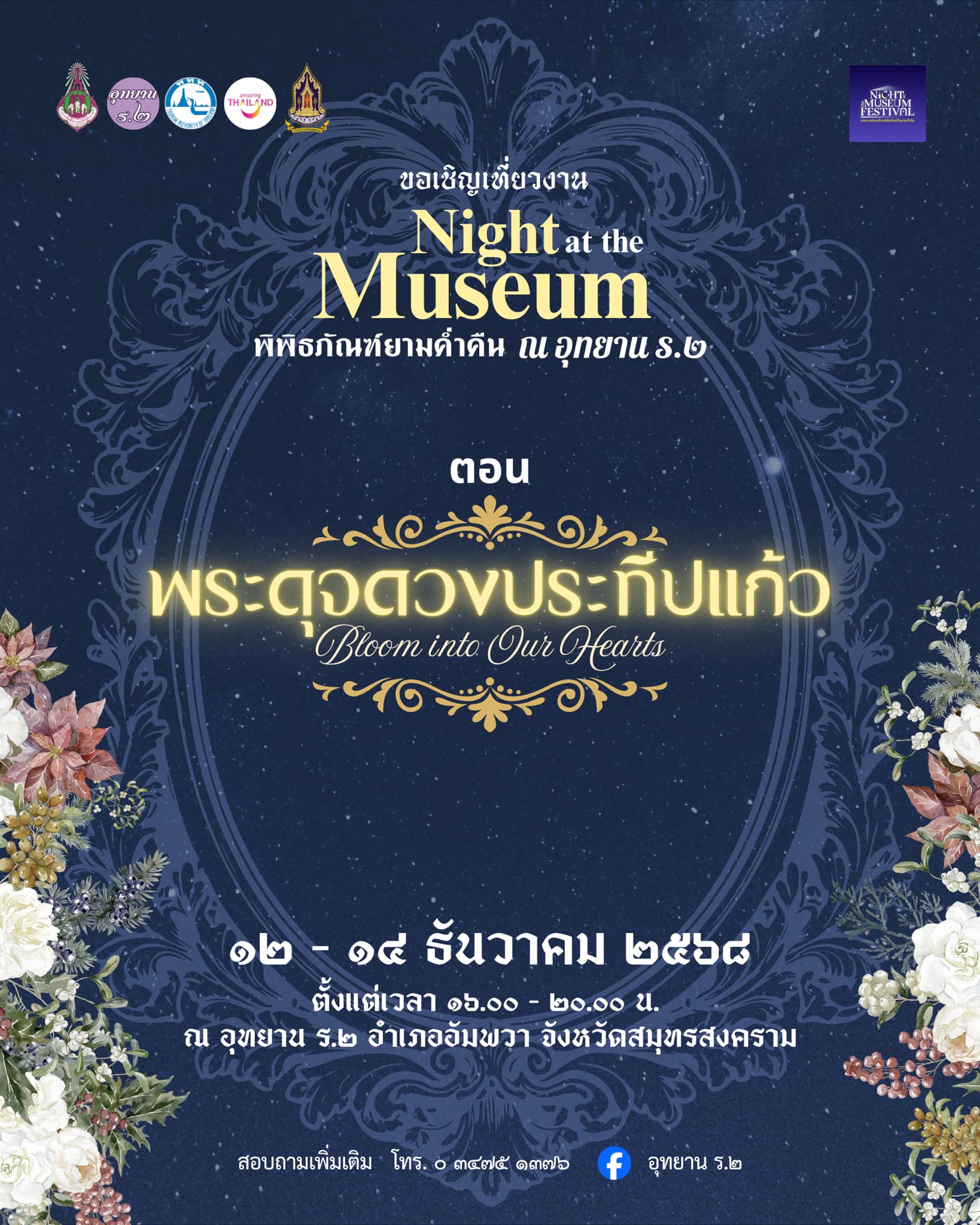 ขอเชิญทุกท่านเที่ยวชมงาน Night at the Museum พิพิธภัณฑ์ยามค่ำคืน ณ อุทยาน ร.๒ ตอน “พระดุจดวงประทีปแก้ว” Bloom into Our Heartsในวันที่ ๑๒ – ๑๔ ธันวาคม ๒๕๖๘ เวลา ๑๖.๐๐ – ๒๐.๐๐ น. ณ อุทยานพระบรมราชานุสรณ์พระบาทสมเด็จพระพุทธเลิศหล้านภาลัย (อุทยาน ร.๒) อำเภออัมพวา จังหวัดสมุทรสงคราม