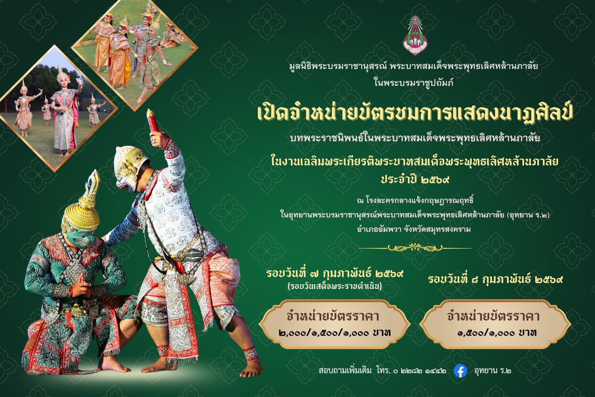 เปิดจำหน่ายบัตรชมการแสดงนาฏศิลป์บทพระราชนิพนธ์ในพระบาทสมเด็จพระพุทธเลิศหล้านภาลัย ในงานเฉลิมพระเกียรติพระบาทสมเด็จพระพุทธเลิศหล้านภาลัย ประจำปี ๒๕๖๙ ณ โรงละครกลางแจ้งกฤษฎารณฤทธิ์ อุทยานพระบรมราชานุสรณ์พระบาทสมเด็จพระพุทธเลิศหล้านภาลัย (อุทยาน ร.๒) อำเภออัมพวา จังหวัดสมุทรสงคราม